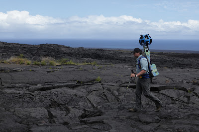 Street View Operations Lead Chris Fiock teaches Jaci Matsuo of HVCB and Rob Pacheco of Hawaii Forest & Trail how to operate the Trekker using its Android device at Hawai‘i Volcanoes National Park
