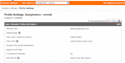 Sign in to Google Analytics. Select a profile from the accounts Overview page. From that profile's Actions column, click Edit. At the top right of the "Main Website Profile Information" box, click Check Status (look at graphic below to find this link).