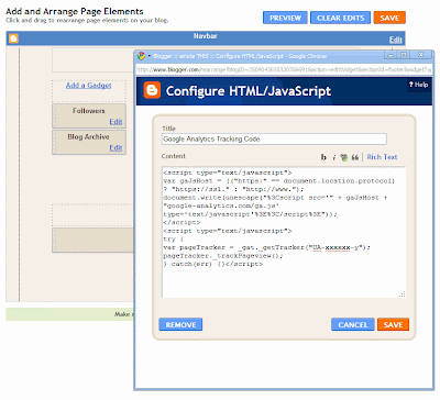 I used my Blogger account to add the tracking code. All I had to do was add a "Configure HTML/JavaScript" gadget from the "Page Elements" customization section and paste the tracking code into the field.