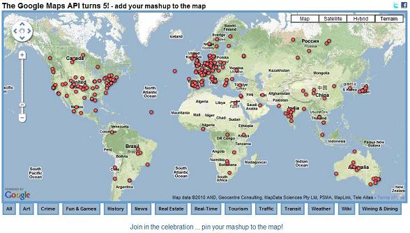 Today, on this 5 year milestone, we really have all of you to thank for this incredible chapter in web and mapping development. The remarkable levels of innovation, creativity and interest have come from all of you. You saw the possibilities the Google Maps API held and what it could be combined with to create, and you built it. Now join us to celebrate! Keir Clarke from Google Maps Mania has created a mashup that we want all of you to contribute to. Please tag your Google Maps mashup or tool to the map wherever you are: