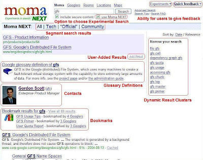 To start with, we chose to place a checkbox underneath the search box which allows users to pass their search queries to an alternate front end where we can try neat experiments (like different ways to return the results, new and interesting OneBox implementations, etc.). Since only some percentage checks the box, it gives us a great way to test out new ideas and new technologies before releasing them to the main search results page. For instance, you might want to use this alternate front end to test out a different look-and-feel for your XSLT; you might want to filter out certain domains to see if it improves the results; you might want to try out some new OneBox modules; you might want to turn on/off Query Expansion (word stemming, synonyms, etc.); you might want to try source biasing. In future posts we'll talk about the many ways in which we've used this Next search screen.