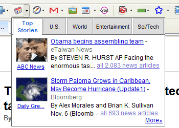 Our friends at the Toolbar team recently launched Google Toolbar 5 for Internet Explorer out of beta in 40 languages. To celebrate this occasion and Toolbar's upcoming eighth birthday, we upgraded our Google News Toolbar gadget: You'll now find tabs with different Google News sections embedded directly into the toolbar, so you can read the news as soon as it breaks, browse top news headlines and images, all without having to leave the site you're on: