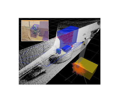 The UBC team approached the contest in two distinct phases: a mapping phase, and an object identification phase. The strategy of UBC this year was first to navigate the environment and map it using the SICK LIDAR and a SLAM algorithm (Simultaneous Localization and Mapping). Then the robot would revisit the obstacles in the room and scan them with the Hokuyo LIDAR. Flat horizontal surfaces would be detected in the scans from detection of a few consistent surface normals and a verification stage of the hypothesis of a planar surface. The regions that point out of the plane are interpreted as objects, and 3D bounding are computed from their convex hull (see figure below). This gives a set of candidate locations for the objects. The robot then would revisit these locations to take snapshots and run its object recognition algorithms on these snapshots. Three object recognition methods were implemented, SIFT matching, Contour matching, Deformable Parts Models (DPM). A fourth one using spherical harmonics to recognize 3D data was turned off because it was not quite ready. The DPM approach was trained on the objects known in advance, but could not be used for internet images as it was slightly too slow for that even though it had been rewritten in C.