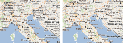 Below are some nice examples of improvements in Europe and China. Many Italian cities are now labeled with translated English names and China now has province names in English.